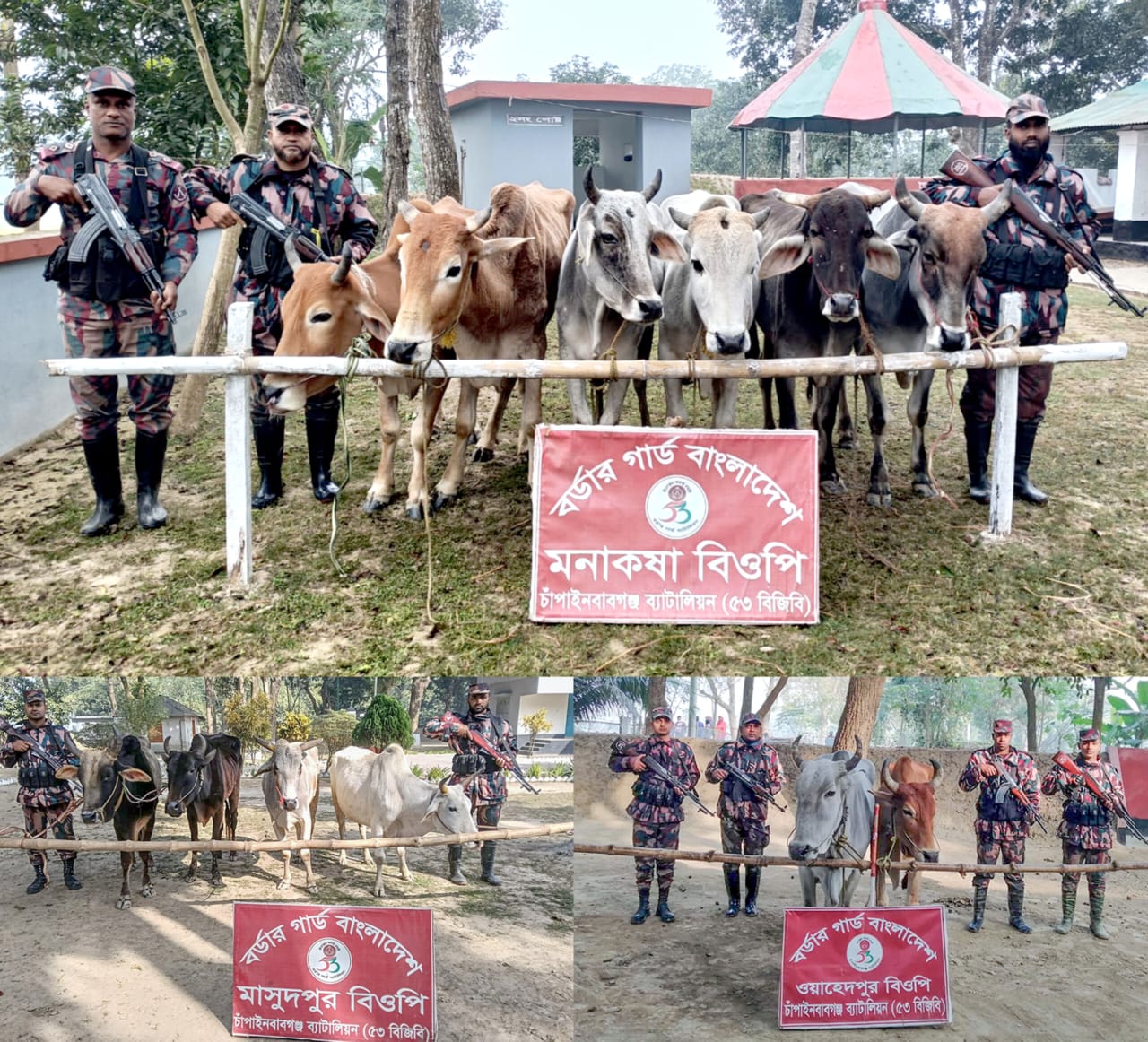 চাঁপাইনবাবগঞ্জ ব্যাটালিয়ন (৫৩ বিজিবি) গোপন তথ্যের ভিত্তিতে শনিবার ১০ জানুয়ারি ভোর ০৫টা হতে ০৯টা প্রায় ৪ ঘন্টা পর্যন্ত ৫৩ বিজিবি এর বিশেষ টহলদল পৃথক পৃথক ০৪টি অভিযান পরিচালনা করে ১৬টি গরু জব্দ করে। অভিযানসমূহে ৫৩ বিজিবির অধীনস্থ মনাকষা বিওপি শিবগঞ্জ থানাধীন মনাকষা ইউনিয়েনের মনোহরপুর গ্রাম হতে ০৬টি ও ফকিরপাড়া গ্রাম হতে ০৪টি, মাসুদপুর বিওপি শিবগঞ্জ থানাধীন মনাকষা ইউনিয়নের চৌধুরী স্মরণী গ্রাম হতে ০৪টি এবং ওয়াহেদপুর বিওপি শিবগঞ্জ থানাধীন সূর্যনারায়নপুর ইউনিয়নের তেররশিয়া গ্রাম হতে ০২টি গরু জব্দ করা হয়।