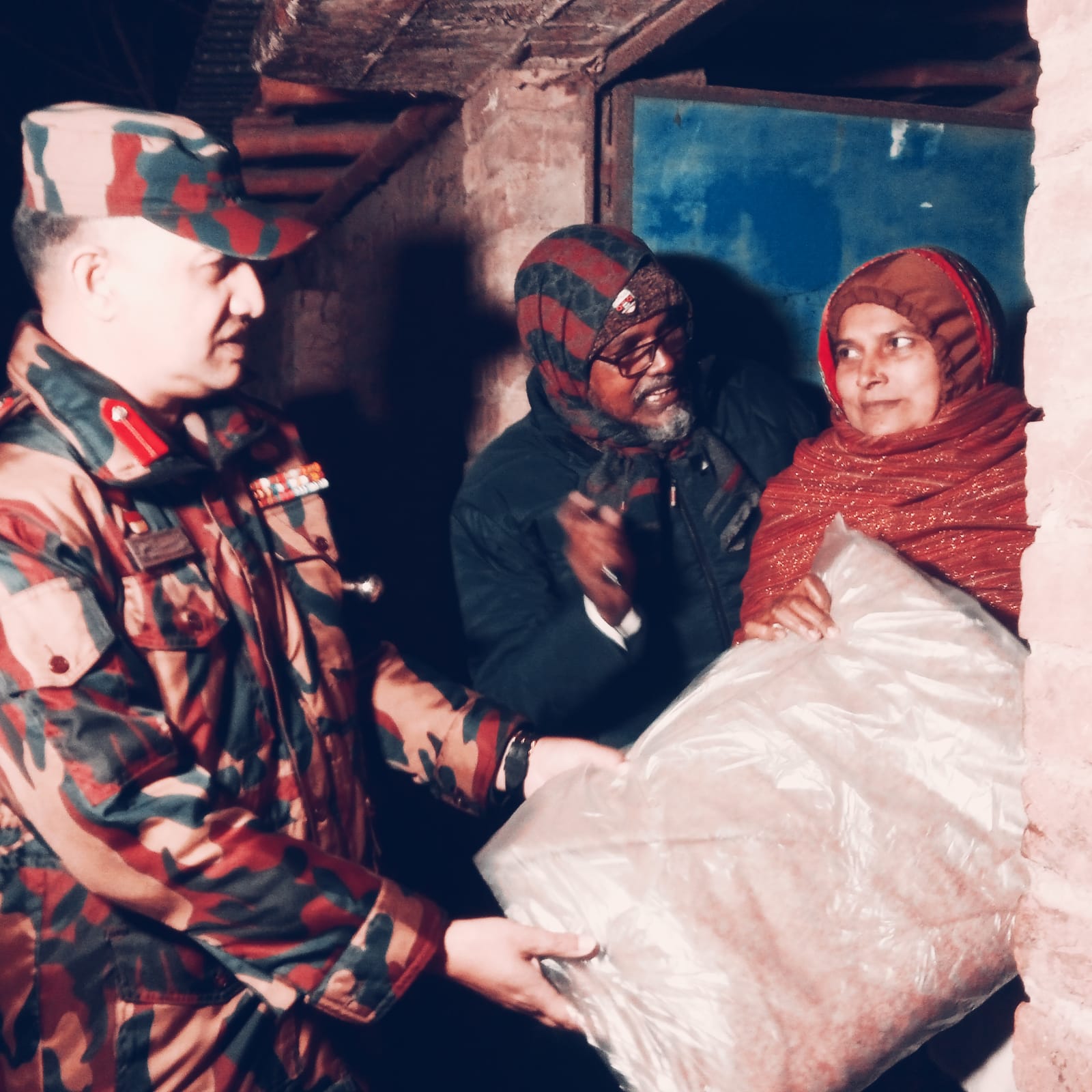 চাঁপাইনবাবগঞ্জে বিগত কয়েকদিন যাবৎ উত্তরবঙ্গের কয়েকটি জেলায় শীতের তীব্রতা আশঙ্কাজনকহারে বৃদ্ধি পায় এবং তাপমাত্রা ৮-৯ ডিগ্রিতে নেমে আসে। এতে সাধারণ জনগণ বিশেষ করে দুঃস্থ, ছিন্নমুল ও অসহায় ব্যক্তিবর্গ প্রচন্ড দুর্দশার মধ্যে পড়ে এবং তাদের স্বাভাবিক জীবনযাত্রা ব্যাহত হয়। সেই উপলব্ধি থেকেই গতকাল ১১ জানুয়ারি অধিনায়ক, মহানন্দা ব্যাটালিয়ন (৫৯ বিজিবি) নিজ উদ্যোগে লোক চক্ষুর অন্তরালে বিনা প্রচারণায় রাতের আঁধারে চাঁপাইনবাবগঞ্জ জেলাধীন শিবগঞ্জ উপজেলার দায়িত্বপূর্ণ সীমান্ত এলাকায় গমন করেন এবং শীতার্ত অসহায় মানুষের পাশে স্ব-হস্তে উষ্ণতার প্রতীকী স্বরূপ কম্বল নিয়ে দ্বারে দ্বারে হাজির হন। তাঁর এ মানবিকতায় সুবিধাভোগীরা আবেগ-আপ্লুত ও আশ্চার্যান্বিত হয়ে পড়েন এবং বিজিবি’র প্রতি গভীর কৃতজ্ঞতা প্রকাশ করেন। মহানন্দা ব্যাটালিয়ন (৫৯ বিজিবি) অধিনায়কের এই উদার ও জনহিতকর কর্মকান্ডে বিজিবি’র ভাবমূর্তি বেসামরিক অঙ্গনে বহুল প্রশংসিত হয়েছে এবং জনমনে আশার আলো সঞ্চার করেছে। মহানন্দা ব্যাটালিয়ন অধিনায়কের মানবদরদী কর্মকান্ডে সমাজের বিত্তবান ও প্রভাবশালীরা উৎসাহিত ও অনুপ্রাণিত হবে বলে সাধারণ জনগণ মনে করছে।