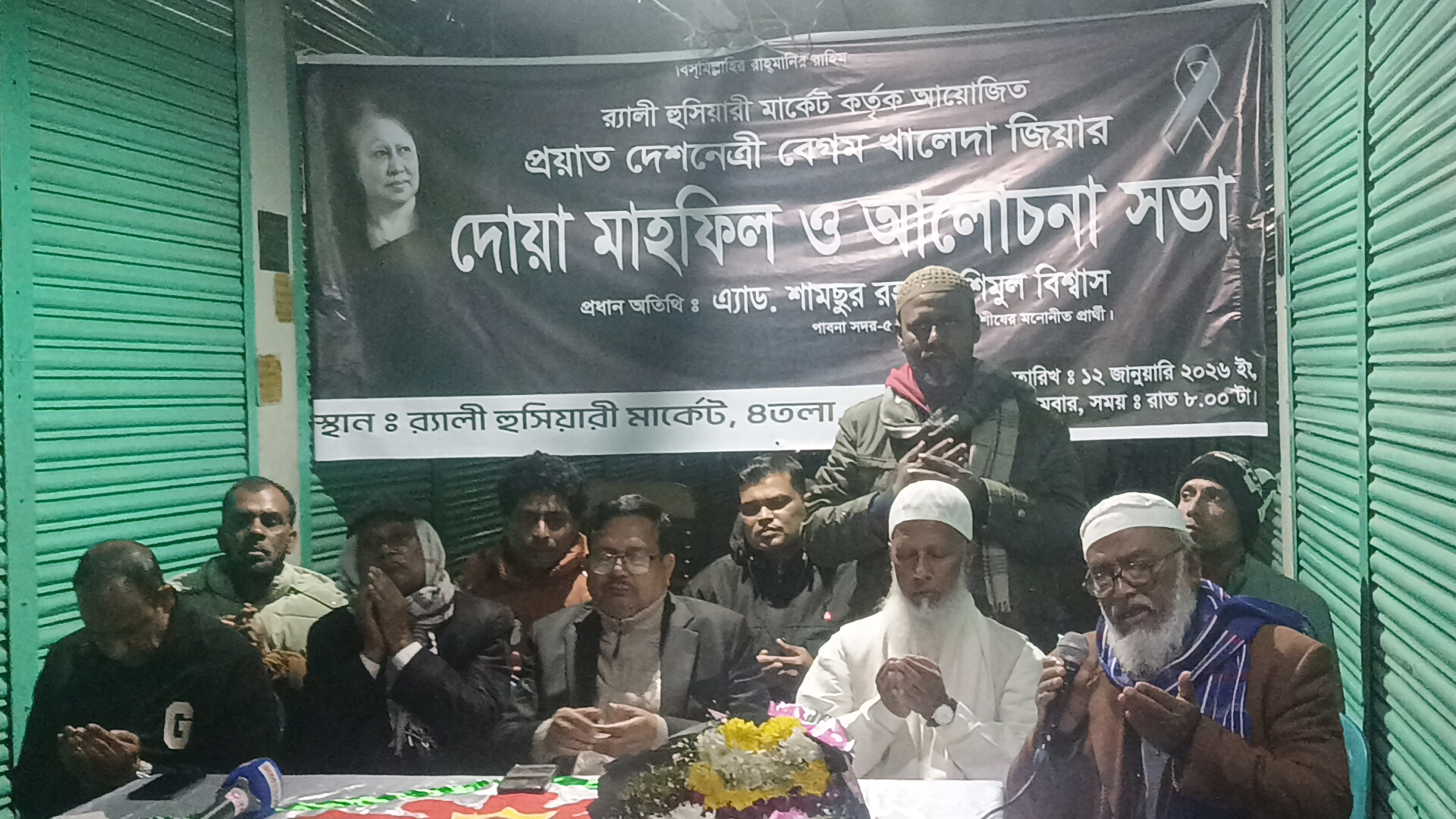 র‍্যালি হুসিয়ারী মার্কেট কর্তৃপক্ষের আয়োজনে অনুষ্ঠিত এ সভায়, দানবীর ও প্রবীণ রাজনীতিবিদ খন্দকার রবিউল আলম র‍্যালির সভাপতিত্বে প্রধান অতিথি হিসেবে উপস্থিত ছিলেন প্রয়াত বিএনপি চেয়ারপার্সন এর বিশেষ সহকারী অ্যাডভোকেট শামসুর রহমান শিমুল বিশ্বাস। বিশেষ অতিথি হিসেবে উপস্থিত ছিলেন জেলা বিএনপির যুগ্ম-আহবায়ক নূর মোহাম্মদ মাসুম বগা, সাবেক পৌর সভাপতি সাবির হাসান বাচ্চু, জেএসডি পাবনা জেলা সভাপতি মোজাম্মেল হোসেন কবির এবং পাবনা জেলা স্বেচ্ছাসেবক দলের সাবেক সভাপতি আরিফুর ইসলাম আরিফ। এছাড়া বাজারের ব্যবসায়ী, স্থানীয় গণ্যমান্য ব্যক্তিবর্গ ও বিএনপির বিভিন্ন পর্যায়ের নেতাকর্মীরা অনুষ্ঠানে অংশ নেন।